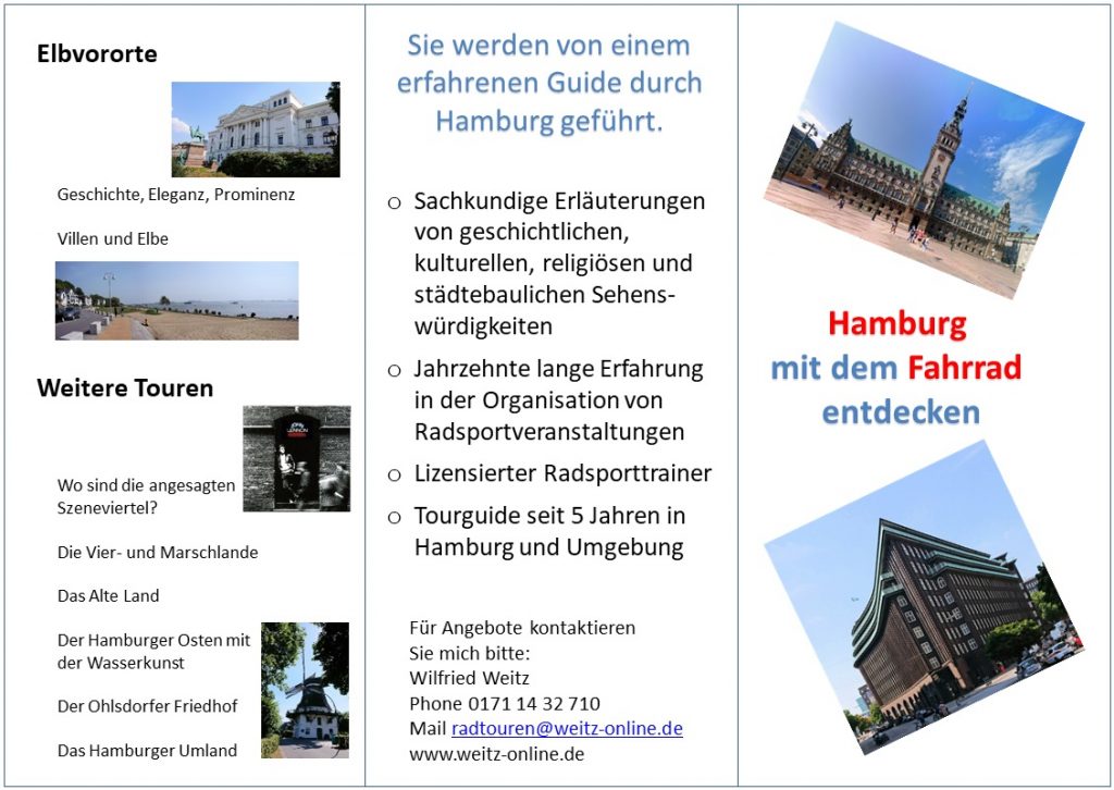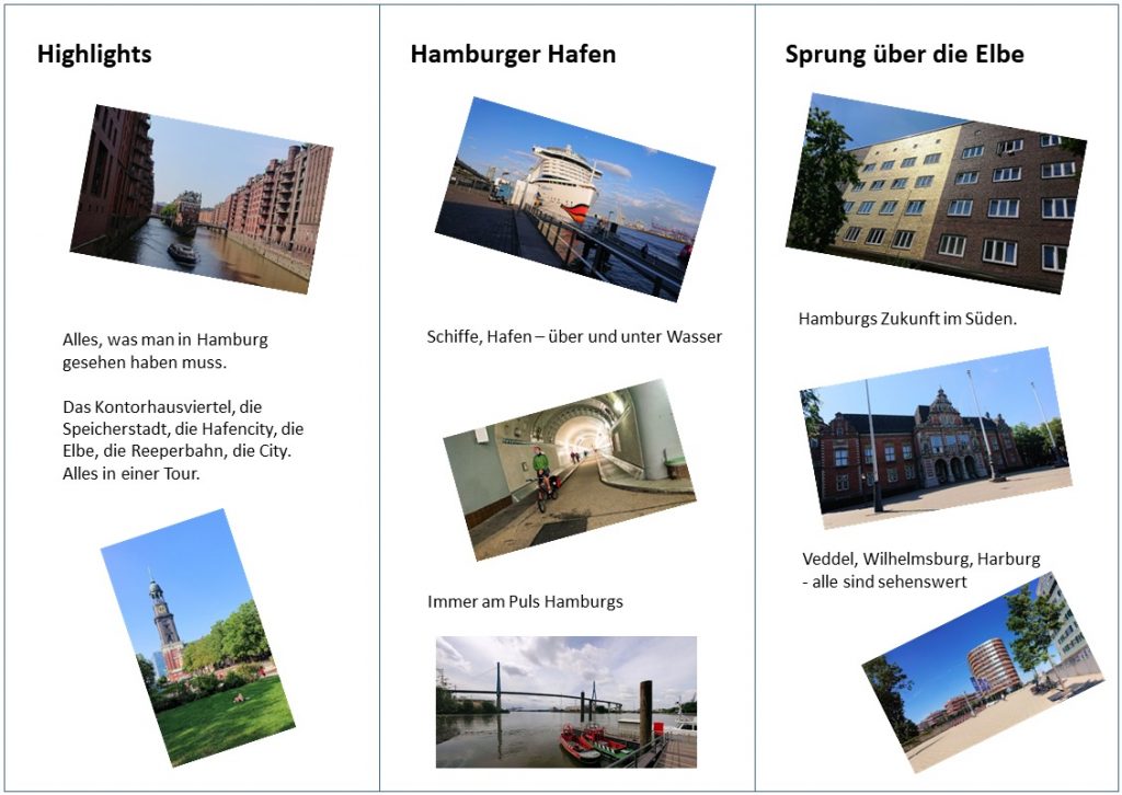 Es gibt viele sehr unterschiedliche Touren durch Hamburg per Fahrrad. Einen kurzen Überblick gibt es auf meinem Flyer: